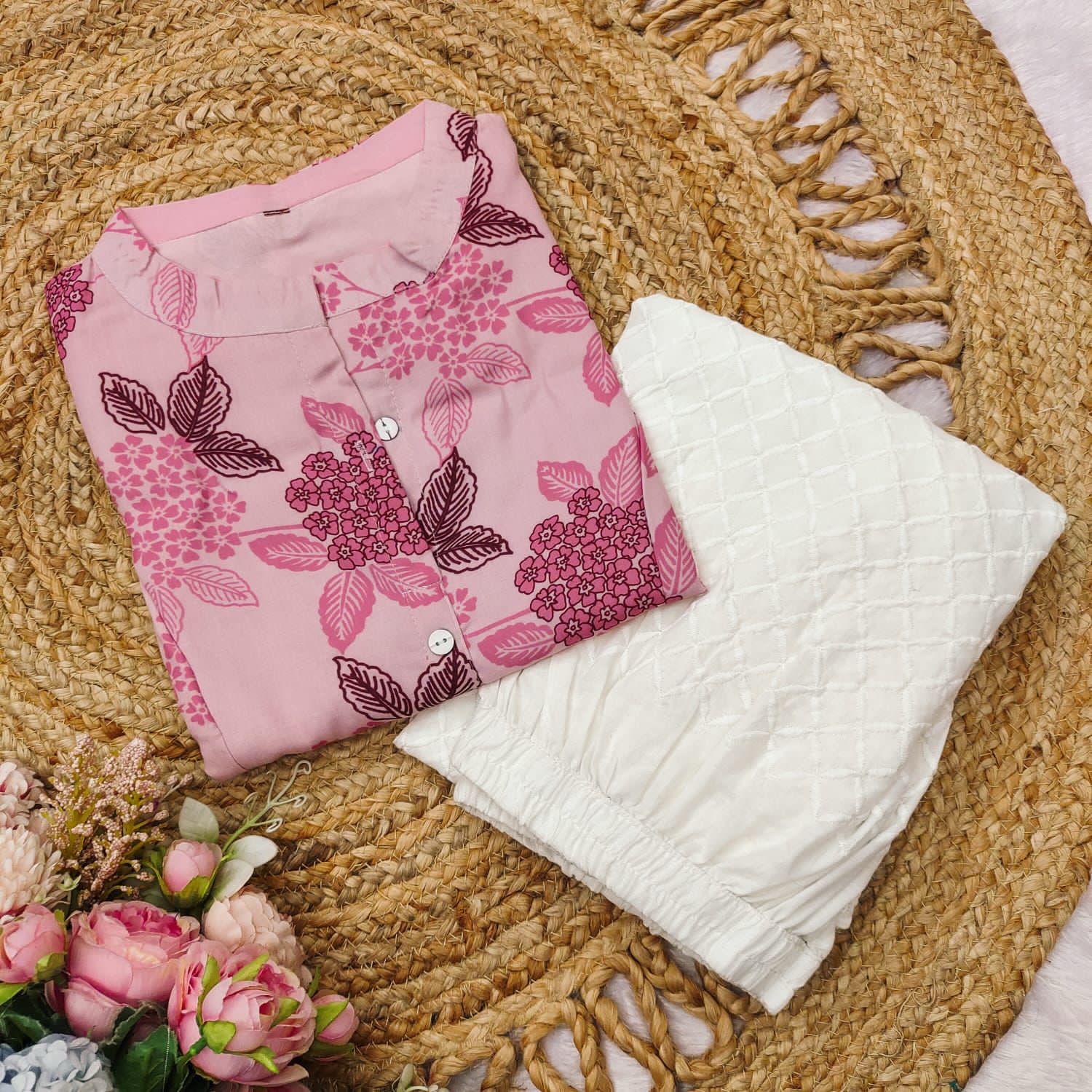 πHe kurtis is the digital print. This modern printing technique allows for intricate designs. kurti with blue paisley or leaf-like digital prints, accompanied by white self-design bottoms.π